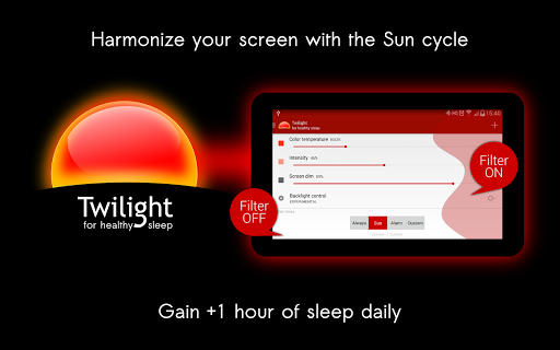 The Twilight app makes your device screen adapt to the time of the day. It filters the flux of blue light emitted by your phone or tablet after sunset and protects your eyes with a soft and pleasant red filter. The filter intensity is smoothly adjusted to the sun cycle based on your local sunset and sunrise times.